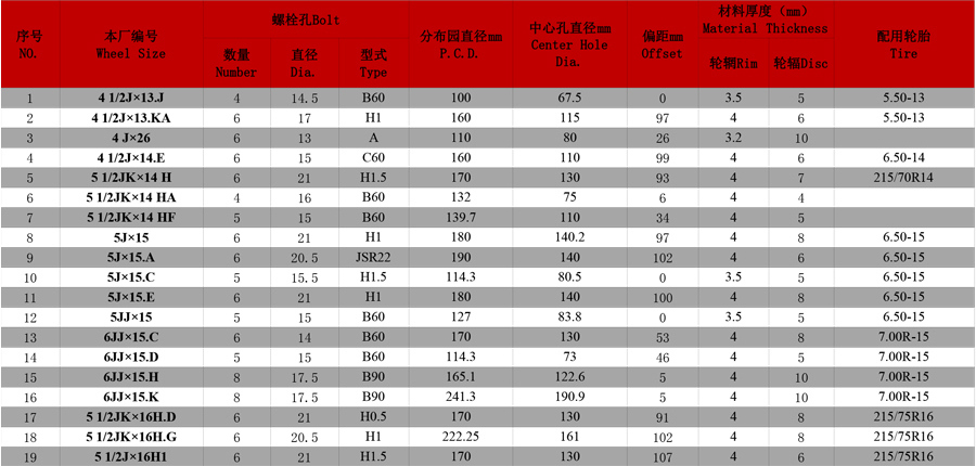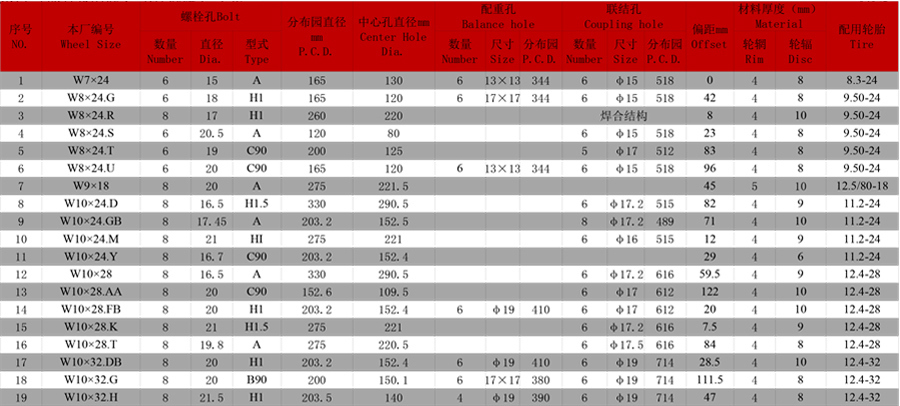 商用車車輪系列參數表格: